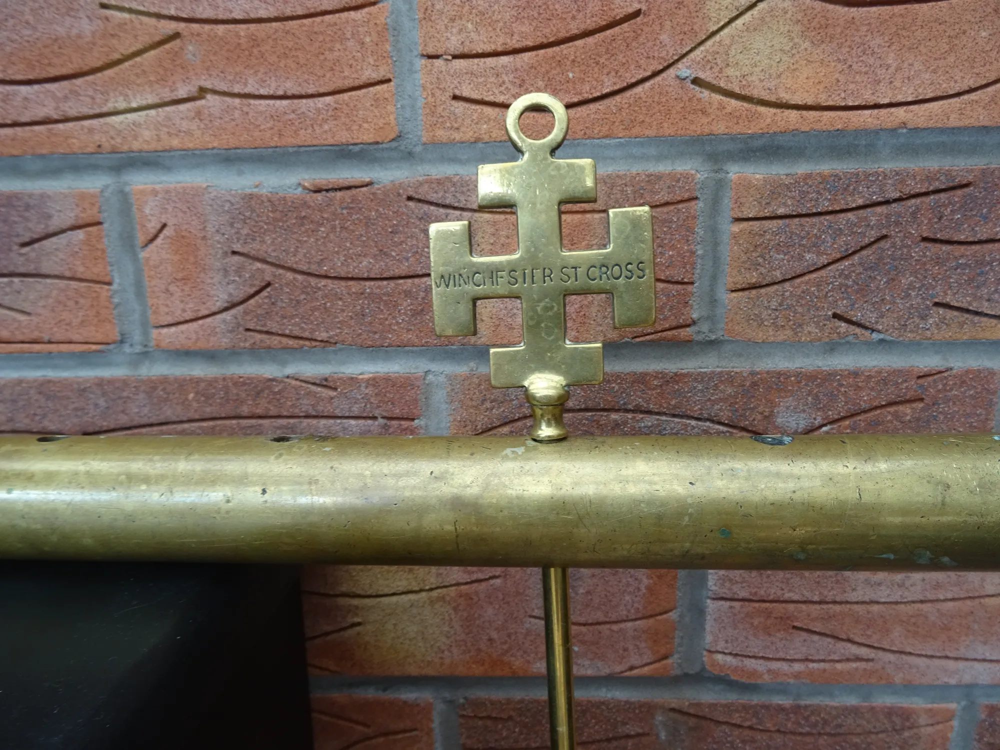 LOVELY SOLID BRASS CROSS TILLER PIN WITH THE WORDING: WINCHESTER ST CROSS. MEASURES APPROX: 8 CM (3¼ INCH) H X 6 CM (2½ INCH) L